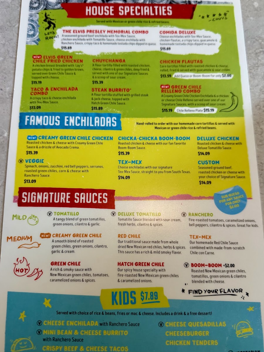 Cheese enchiladas with Tex-Mex Sauce, chicken flautas, a crispy taco, guacamole & homemade tostada chips dipped in queso.
