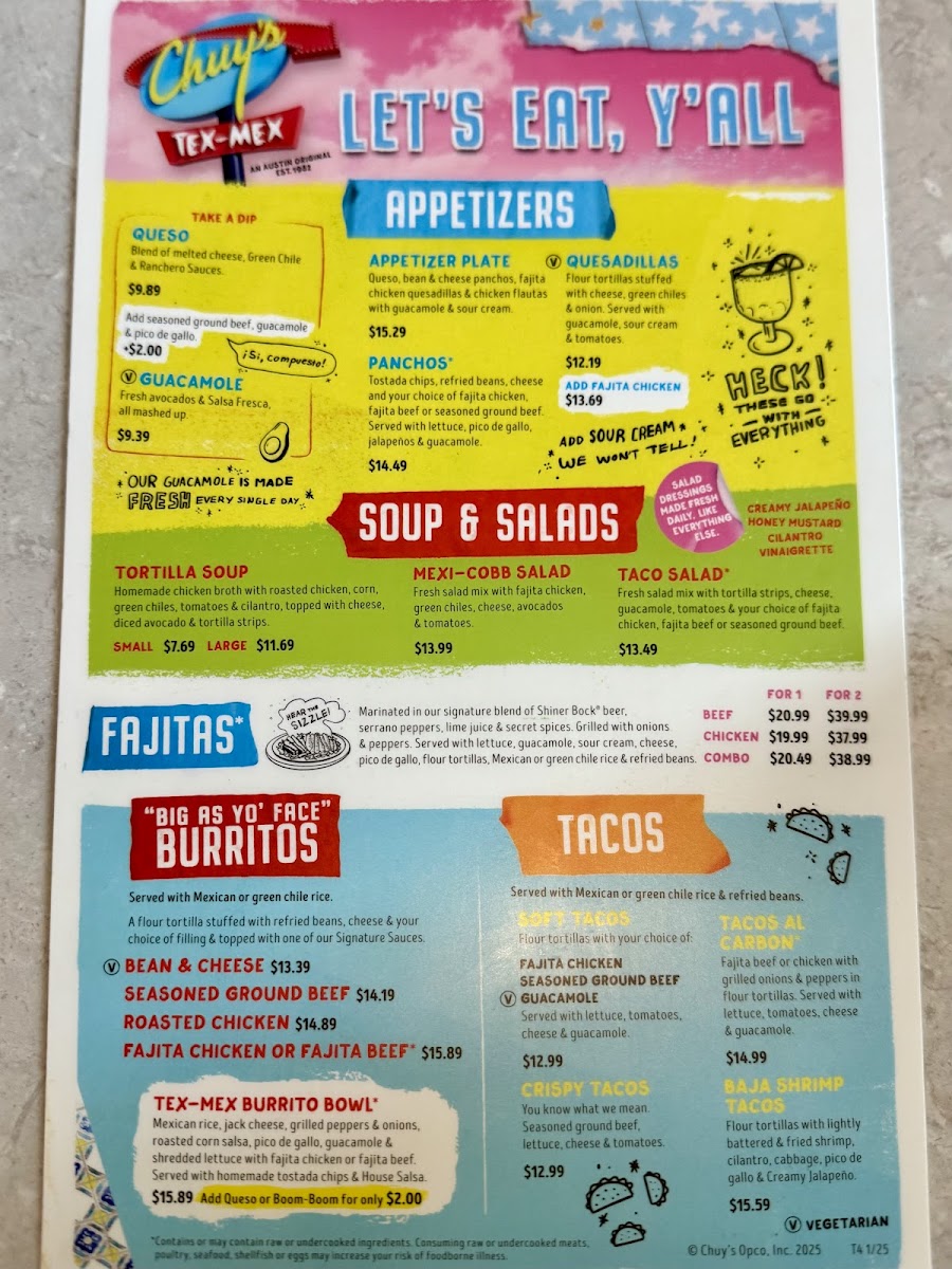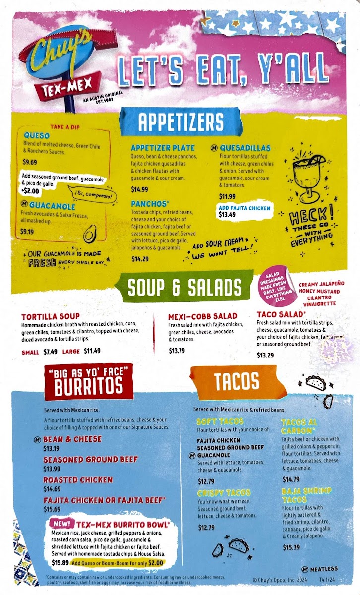 Welcome to Chuy's - VA 22030, where Tex-Mex flair meets an engaging atmosphere. Located at 11219 Lee Hwy in Fairfax, this vibrant restaurant offers a delightful array of dishes. Start your meal with their Tortilla Soup, a savory blend of homemade chicken broth loaded with roasted chicken, corn, and topped with fresh avocado. For those seeking a refreshing touch, the MexiCobb Salad combines fajita chicken, green chiles, and cheese for a satisfying bite.